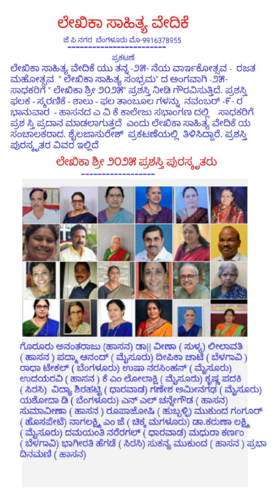 ಬೆಂಗಳೂರಿನ ಲೇಖಿಕಾ ಸಾಹಿತ್ಯ ವೇದಿಕೆಗೆ 25 ವರ್ಷ ತುಂಬಿದ ಪ್ರಯುಕ್ತ ವೇದಿಕೆಯು ತನ್ನ 25ನೇ ವಾರ್ಷಿಕೋತ್ಸವ ರಜತ ಮಹೋತ್ಸವ ಲೇಖಿಕಾ ಸಾಹಿತ್ಯ ಸಂಭ್ರಮದ ಅಂಗವಾಗಿ 25 ಸಾಧಕರಿಗೆ ಲೇಖಿಕಾ ಶ್ರೀ 2025 ಪ್ರಶಸ್ತಿ ನೀಡಿ ಗೌರವಿಸುತ್ತಿದೆ. ಪ್ರಶಸ್ತಿ ಫಲಕ, ಸ್ಮರಣಿಕೆ, ಶಾಲು, ಫಲ ತಾಂಬೂಲಗಳನ್ನು ನವೆಂಬರ್ 9ರ ಭಾನುವಾರ ಹಾಸನದ ಎವಿಕೆ ಕಾಲೇಜು ಸಭಾಂಗಣದಲ್ಲಿ ಸಾಧಕರಿಗೆ ಪ್ರಶಸ್ತಿ ಪ್ರಧಾನ ಮಾಡಲಾಗುತ್ತದೆ ಎಂದು ಲೇಖಿಕಾ ಸಾಹಿತ್ಯ ವೇದಿಕೆಯ ಸಂಚಾಲಕರಾದ ಶ್ರೀಮತಿ ಶೈಲಜಾ ಸುರೇಶ್ ಪ್ರಕಟಣೆಯಲ್ಲಿ ತಿಳಿಸಿದ್ದಾರೆ.