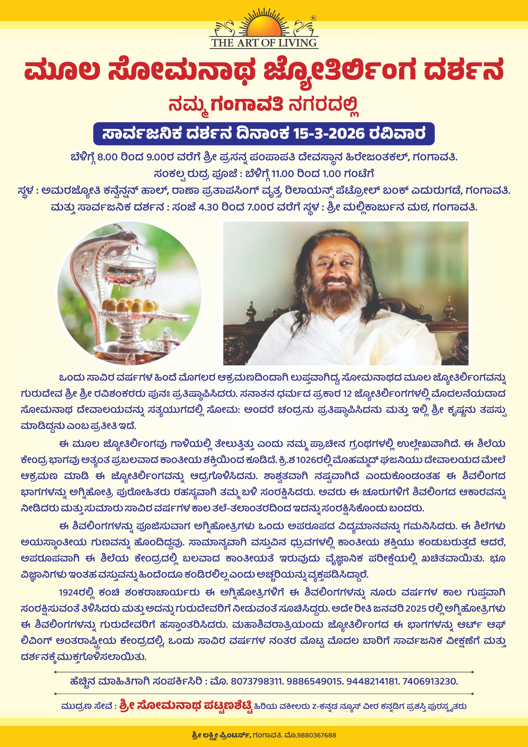 ಗಂಗಾವತಿ: 1000 ವರ್ಷದ ಹಿಂದಿನ ಮೂಲ ಸೋಮನಾಥ ಜ್ಯೋತಿರ್ಲಿಂಗವು ಮೊಘಲರ ಆಕ್ರಮಣದಿಂದ ಲುಕ್ತವಾಗಿದದ್ದು ಅದನ್ನು ಆರ್ಟ್ ಆಫ್ ಲಿವಿಂಗ್ ನ ಶ್ರೀ ಶ್ರೀ ರವಿಶಂಕರ್ ಗುರೂಜಿಯವರು ಪುನರ್ ಪ್ರತಿಷ್ಠಾಪಿಸಿ ಸಾರ್ವಜನಿಕ ವೀಕ್ಷಣೆಗಾಗಿ ಇಡೀ ಕರ್ನಾಟಕದಾದ್ಯಂತ ಪ್ರತಿ ತಾಲೂಕಿಗೆ ಜ್ಯೋತಿರ್ಲಿಂಗವು ಆಗಮಿಸುತ್ತಿದೆ. ಅದರಂತೆ ನಾಳೆ ರವಿವಾರ ಮಾರ್ಚ್-15 ರಂದು ಬೆಳಗ್ಗೆ ಗಂಗಾವತಿಗೆ ಆಗಮಿಸಲಿದೆ ಎಂದು ಆರ್ಟ್ ಆಫ್ ಲಿವಿಂಗ್ನ ಗಂಗಾವತಿ ಮುಖ್ಯ ಸಂಚಾಲಕರಾದ ರಘುನಾಥ ರಘುನಾಥ ಪವಾರ್ ಪ್ರಕಟಣೆಯಲ್ಲಿ ತಿಳಿಸಿದರು.